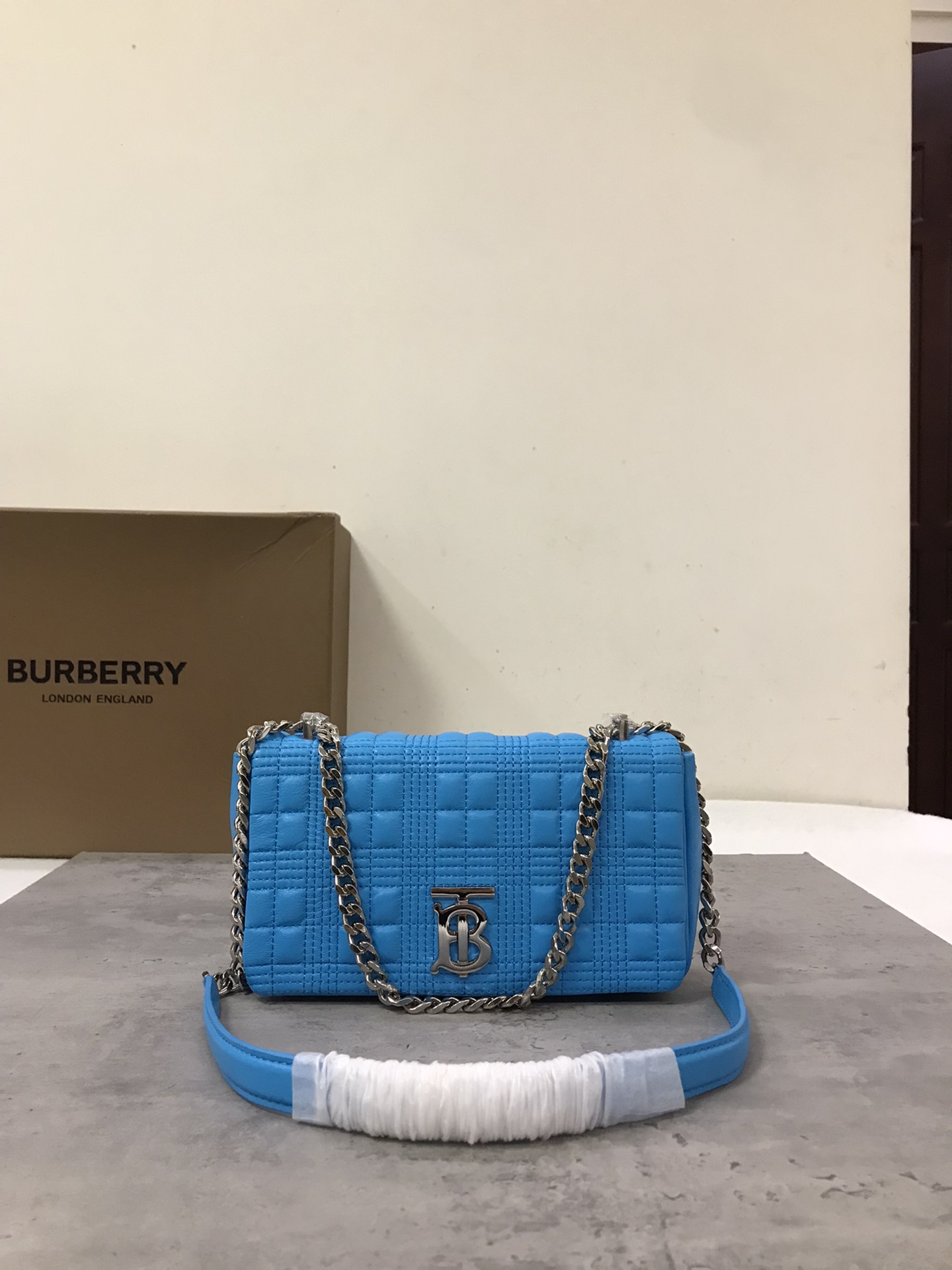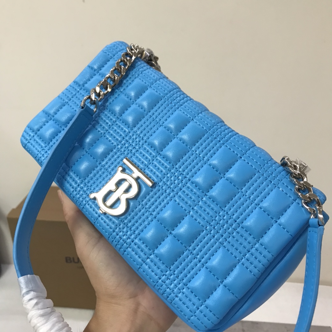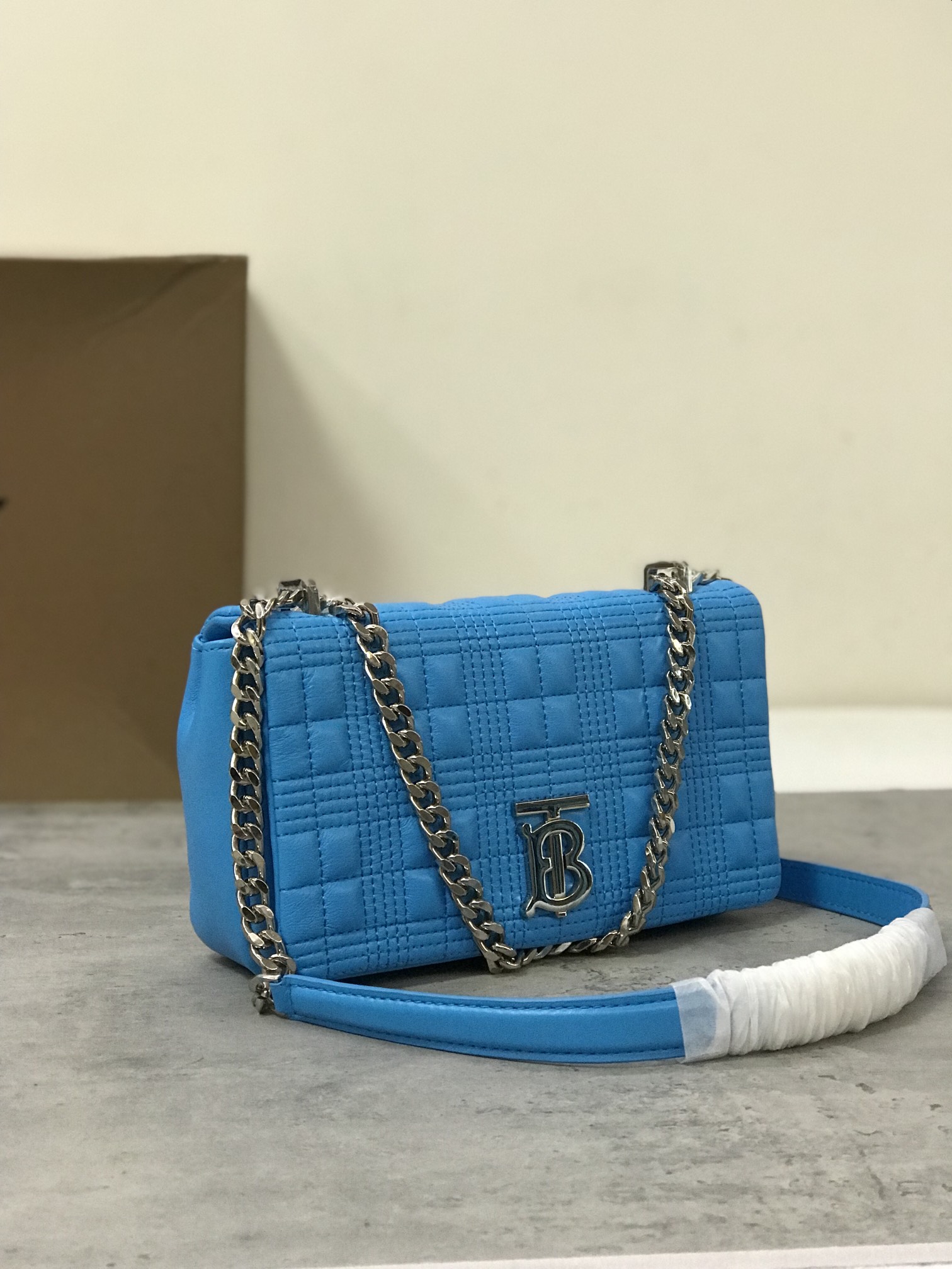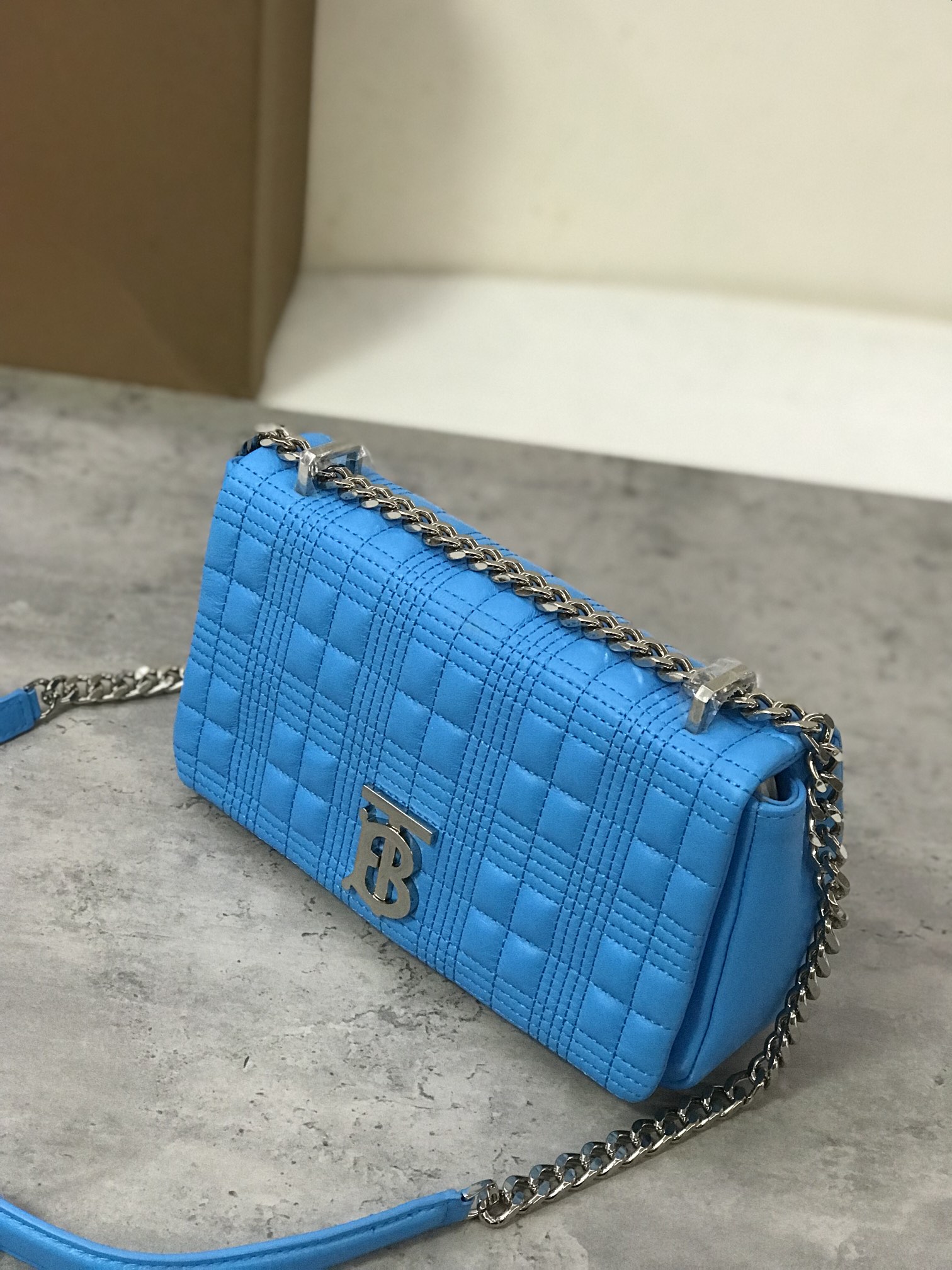 The exquisitely quilted runway-inspired “Lola” bag from premium Burberry is expertly crafted from Italian-tanned lambskin, embellished with the Thomas Burberry logo, and finished with a sophisticated chain strap. It can be carried on one shoulder or crossbody. 23 x 6 x 13cm adjustable chain and lambskin shoulder strap, one interior slip pocket, top flap with magnetic closure, hand-painted lacquer edges, and lustrous metal hardware.