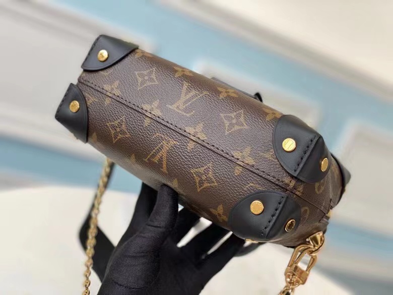 The premium original box M45571 Petite Malle Souple handbag is crafted from Monogram canvas, inlaid with riveted leather trims and a leather branding, showcasing Louis Vuitton’s trunk-making heritage. It features a nautical-inspired chain, Louis Vuitton Malletier embroidery, and a wide, detachable shoulder strap. Features: Monogram coated canvas, cowhide trim, fabric lining, detachable metal decorative chain, detachable leather luggage tag, zippered interior pocket, and detachable, adjustable shoulder strap.
