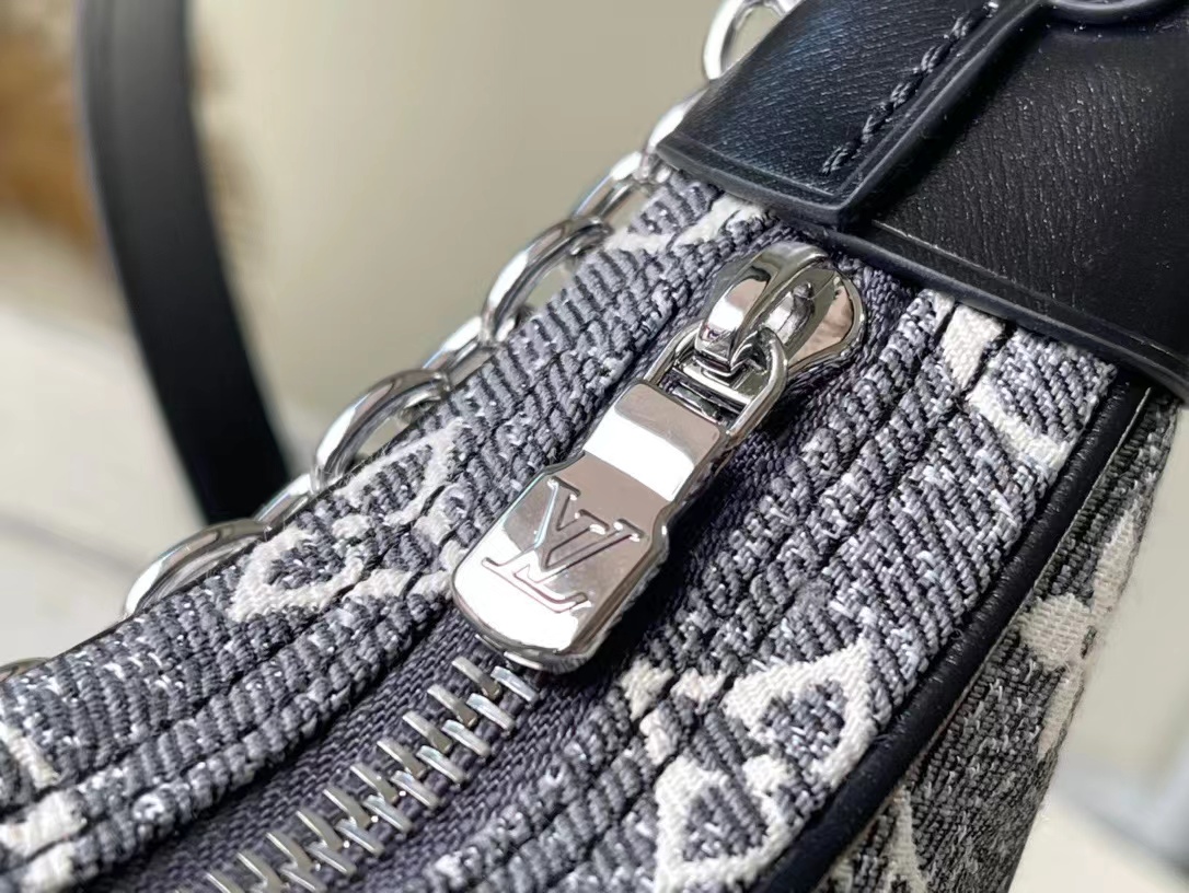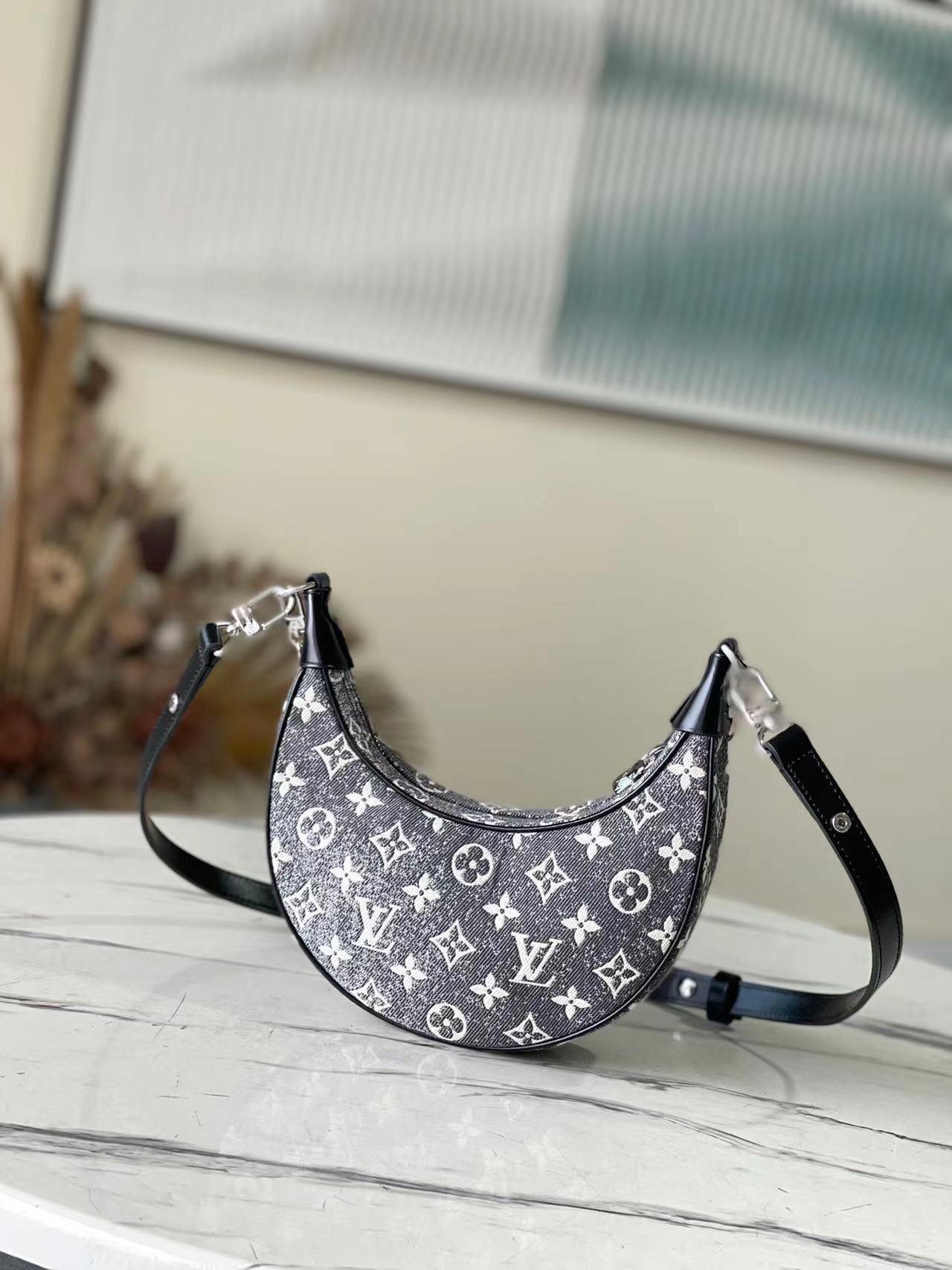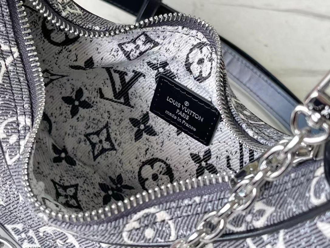M21752 (Denim): This small Loop bag is crafted from new Monogram jacquard denim, reflecting the trends from the Cruise 2023 runway show. Its sandblasted finish creates a rustic feel, contrasting with the striking hardware. The jacquard lining features an unexpected reverse pattern, while the LV Circle zipper pull adds the brand’s signature touch. Dimensions: 23 x 13 x 6 cm
