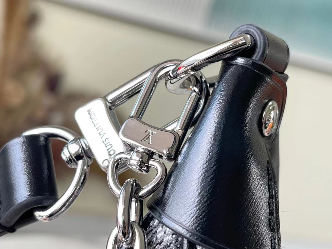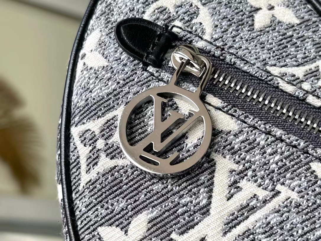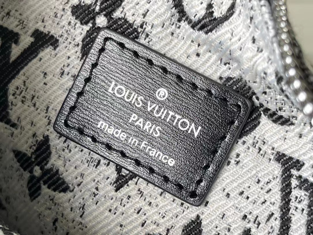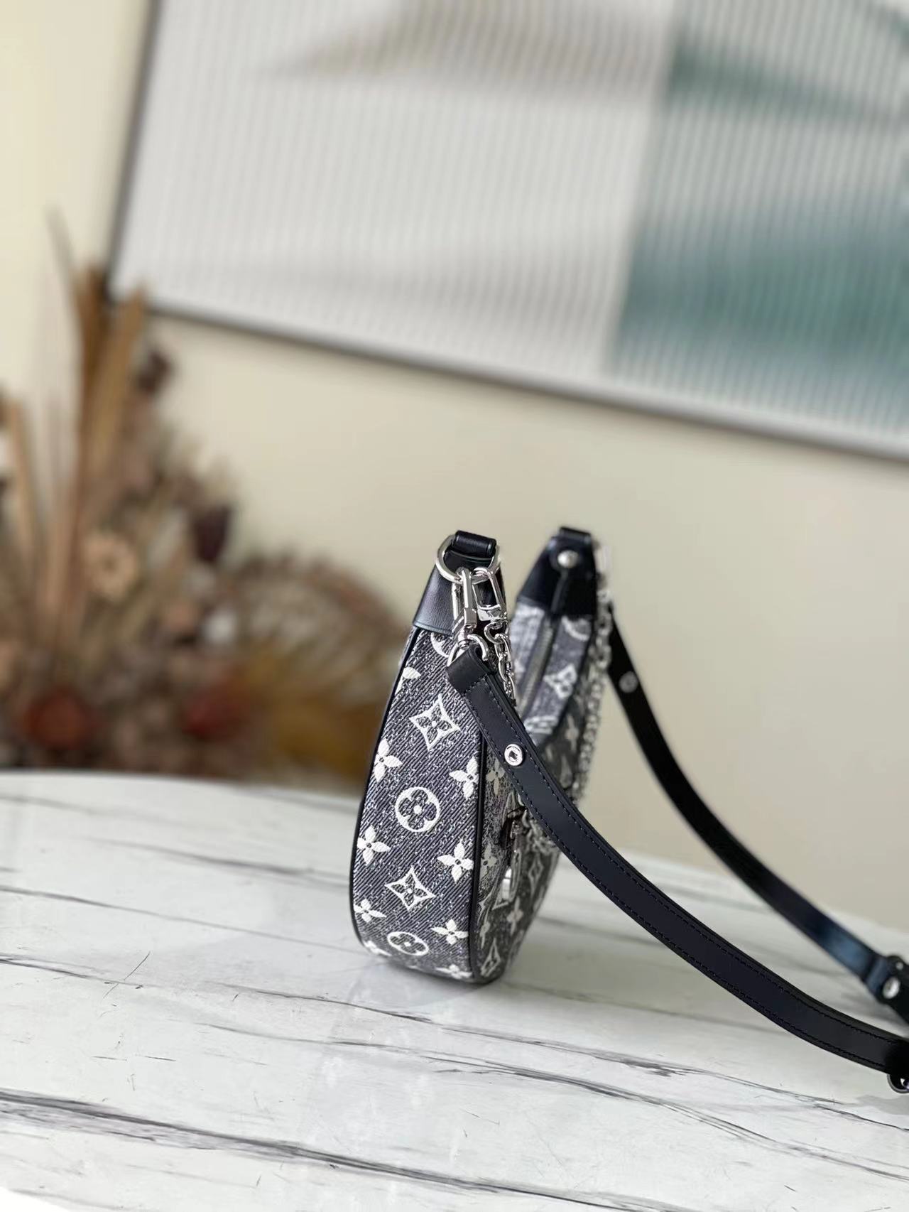 M21752 (Denim): This small Loop bag is crafted from new Monogram jacquard denim, reflecting the trends from the Cruise 2023 runway show. Its sandblasted finish creates a rustic feel, contrasting with the striking hardware. The jacquard lining features an unexpected reverse pattern, while the LV Circle zipper pull adds the brand’s signature touch. Dimensions: 23 x 13 x 6 cm