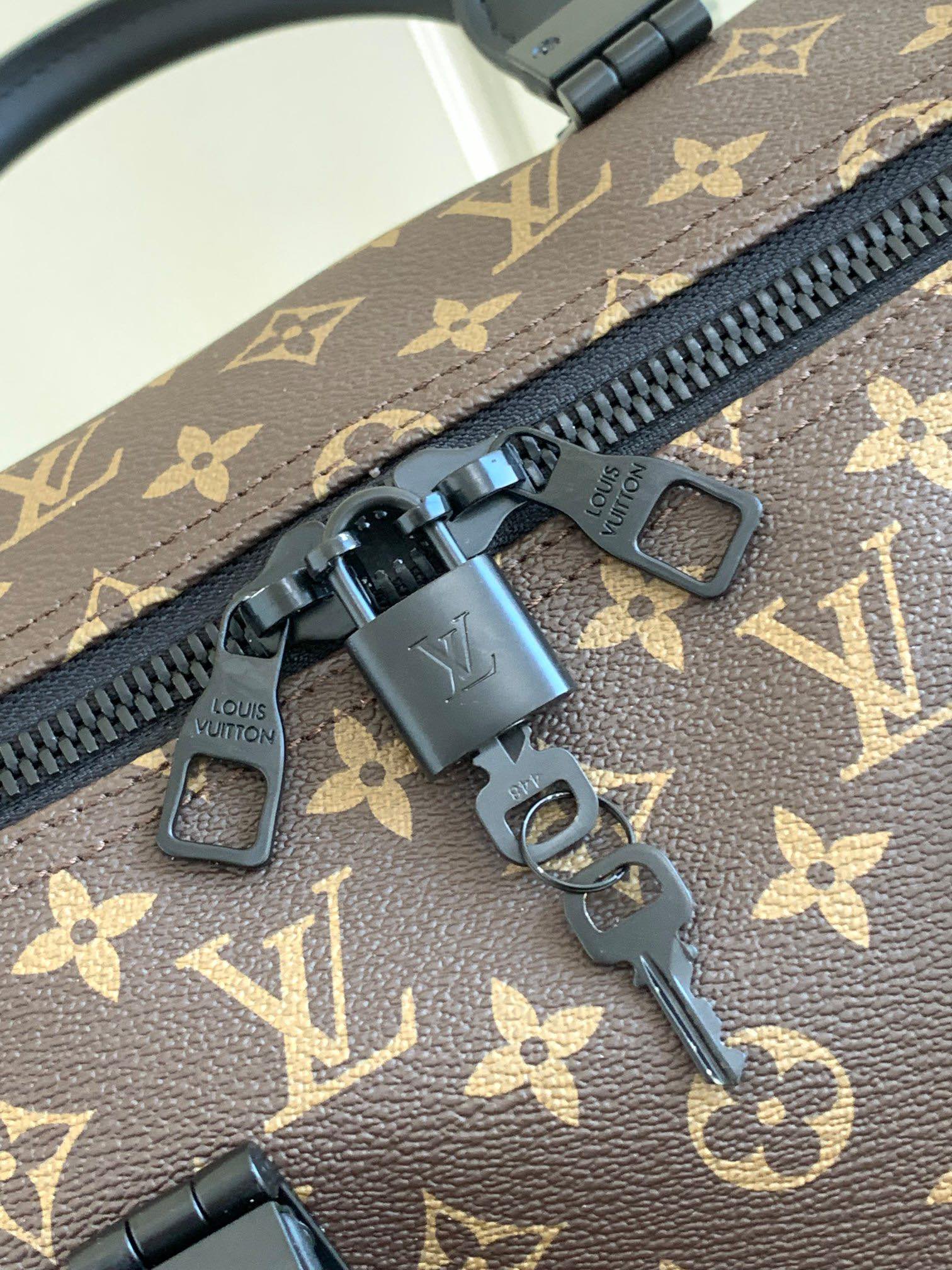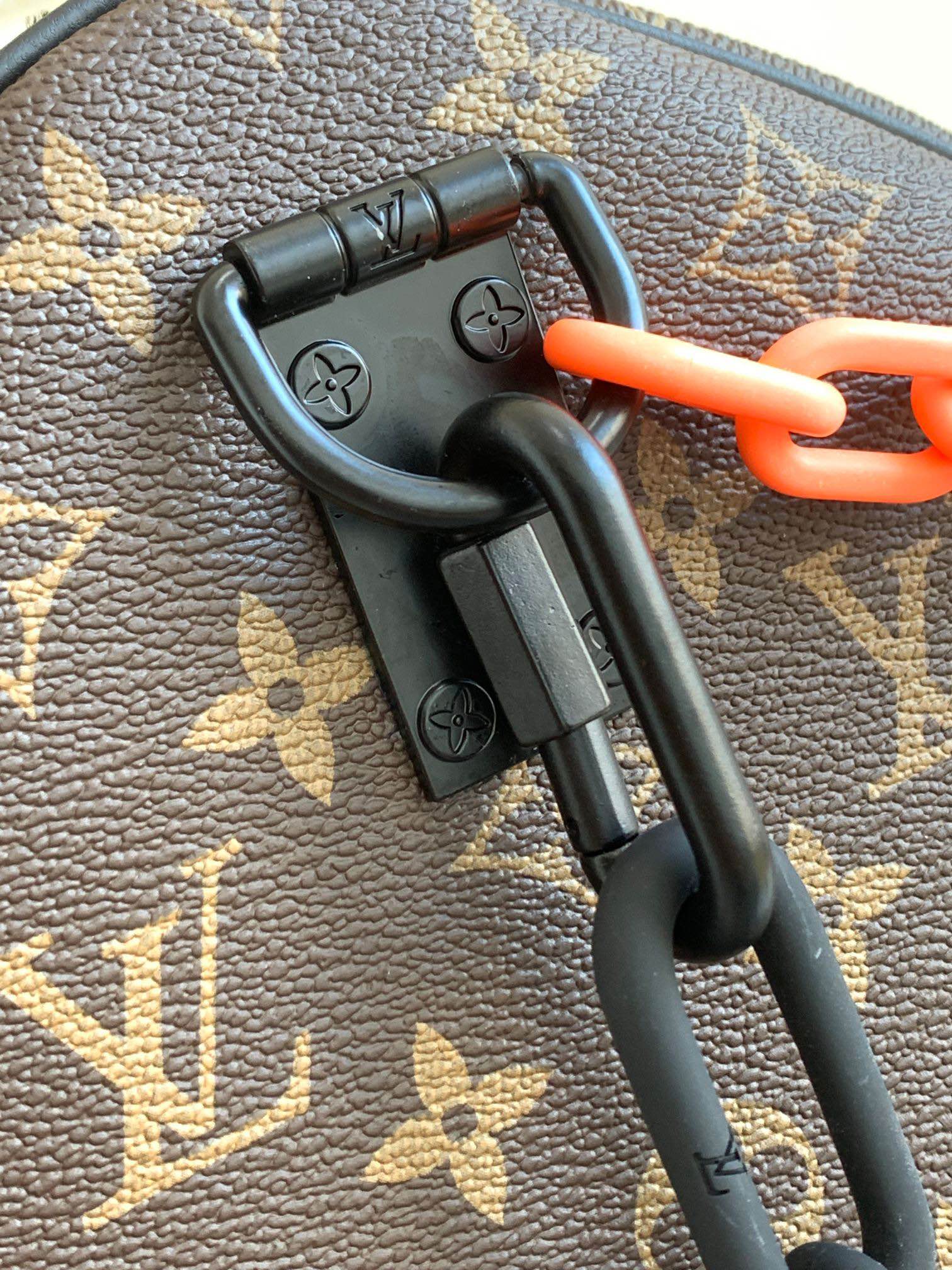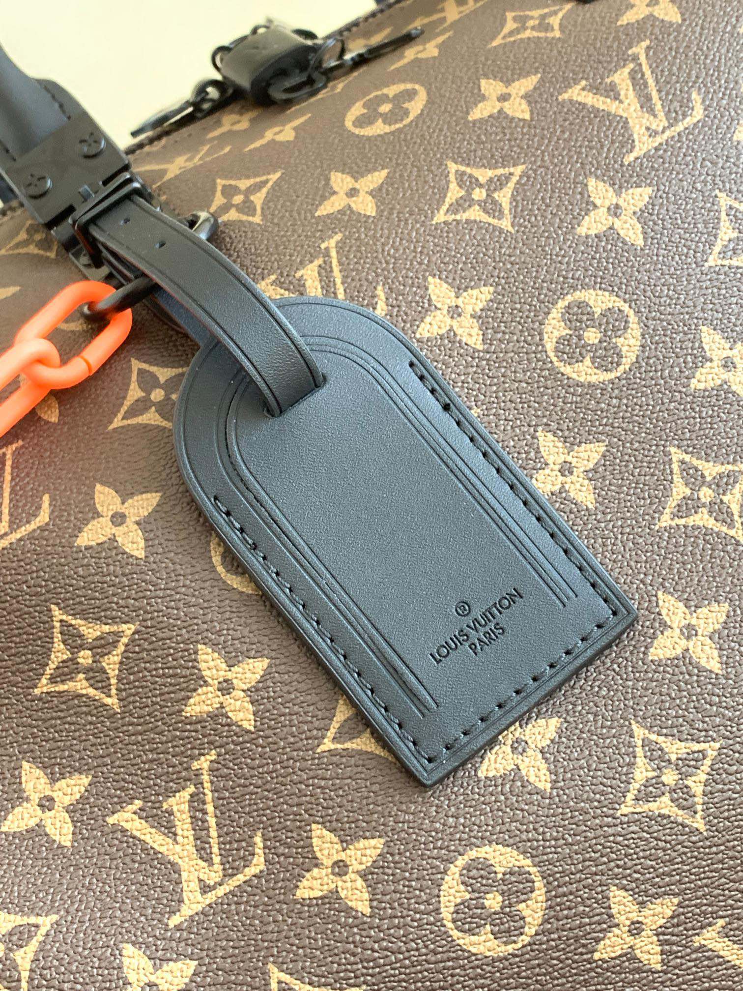 [Haiyuan Overseas Singles, Exclusive Home Photography] M44471 KEEPALL 50 Travel Bag (with Shoulder Strap). Men’s Artistic Director Virgil Abloh has refreshed the brand’s beloved KEEPALL 50 travel bag with a novel design concept, making it even more stunning within the classic style. The iconic Monogram pattern is paired with a matte orange chain to create an urban style. The detachable leather shoulder strap is equipped with a matte black chain for a more stylish and versatile look. Size 50x29x23cm