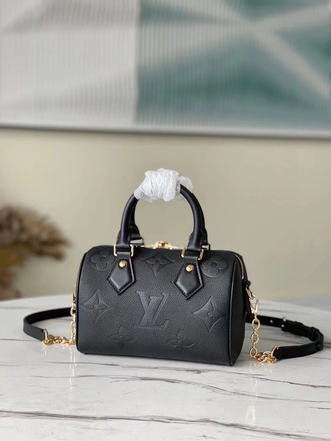 m58953 This Speedy Bandoulière 20 bag is crafted from pearlescent monogram empreinte leather and embellished with an oversized monogram pattern. Its clean silhouette, toron handles, and inscribed padlock are classic brand cues, while the removable chain and leather strap allows for shoulder or crossbody carry. Dimensions: 20.5 x 13.5 x 12 cm
