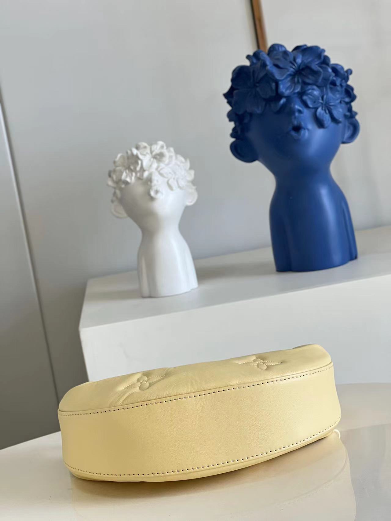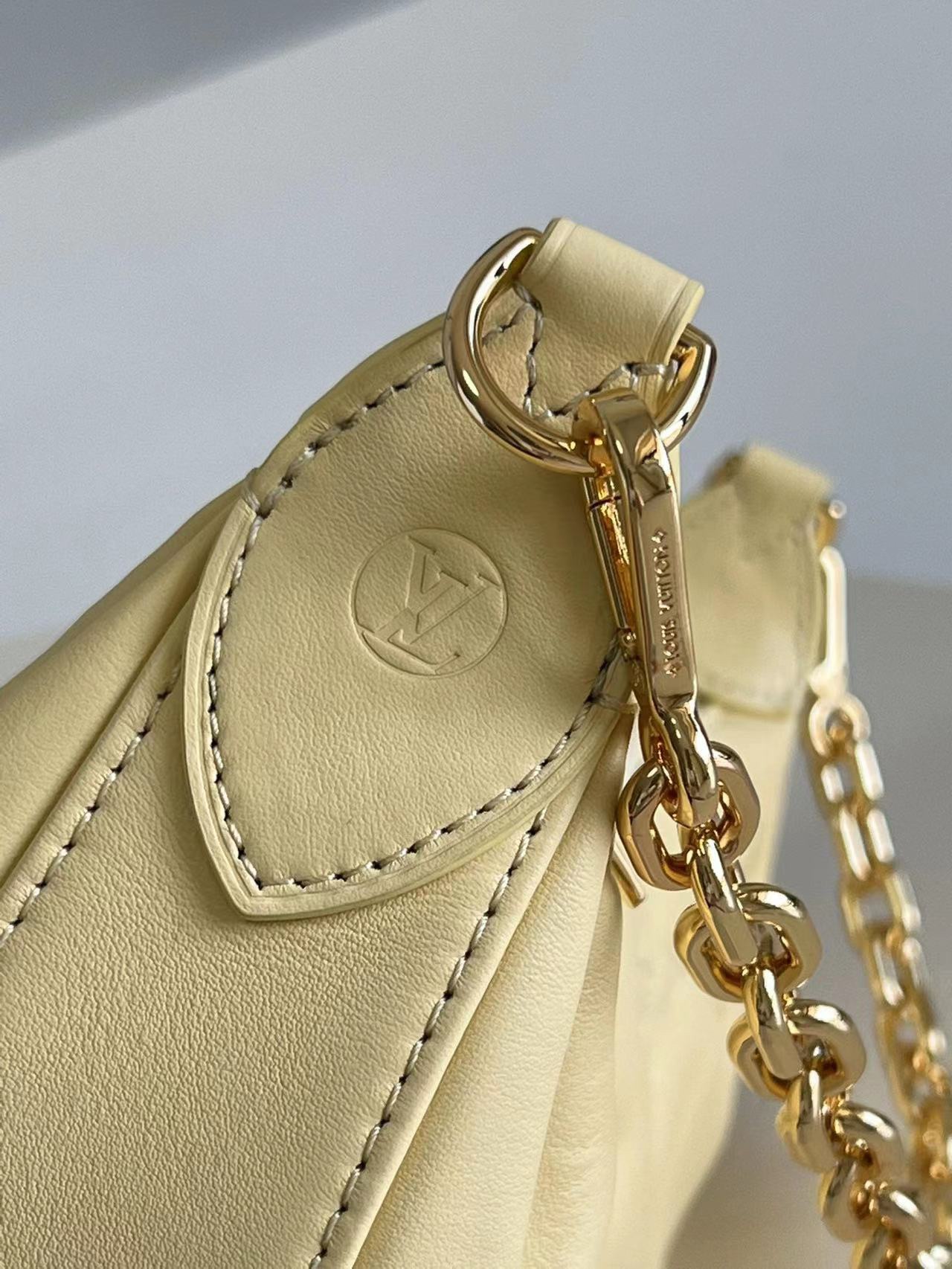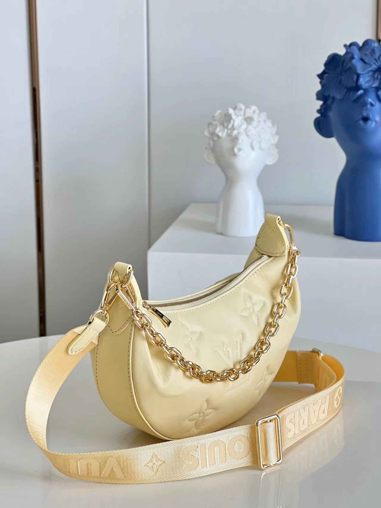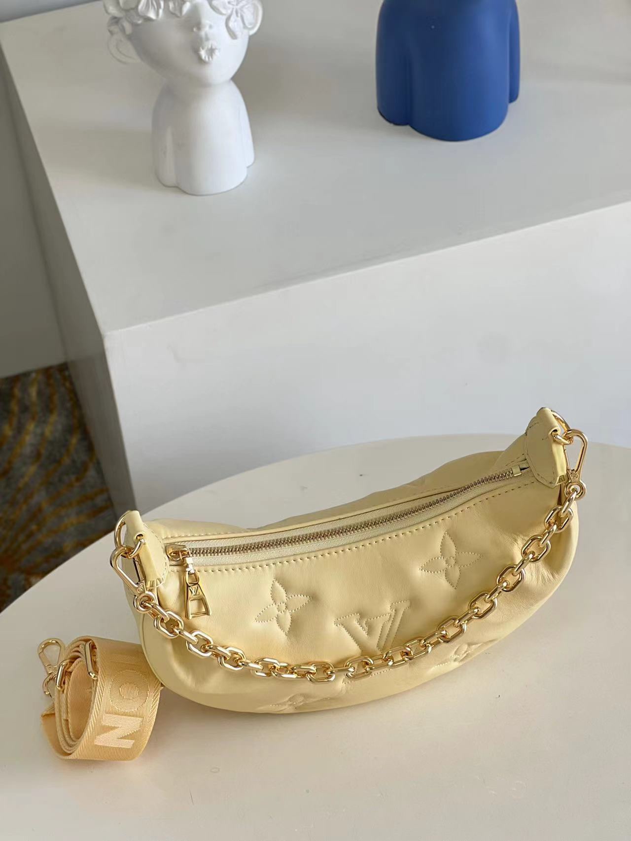 [m59823] Yellow This Over the Moon bag features rich, quilted cowhide leather for a flexible shape, enhanced by monogram embroidery for a sophisticated touch. The adjustable shoulder strap and chain allow for easy carry, including elbow, short shoulder, crossbody, and long shoulder. Remove the strap to transform it into an evening clutch. Details: 27.5 x 16 x 7 cm (length x height x width)
