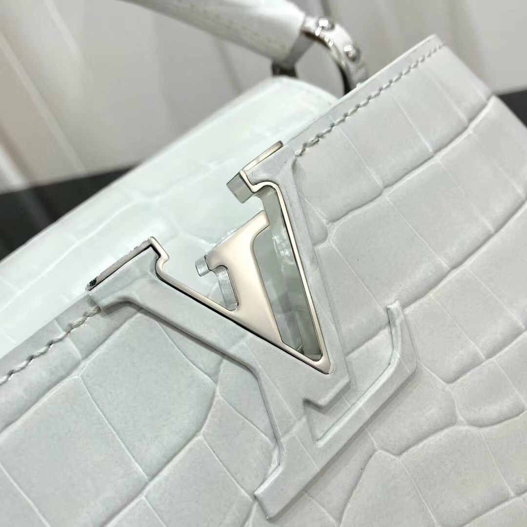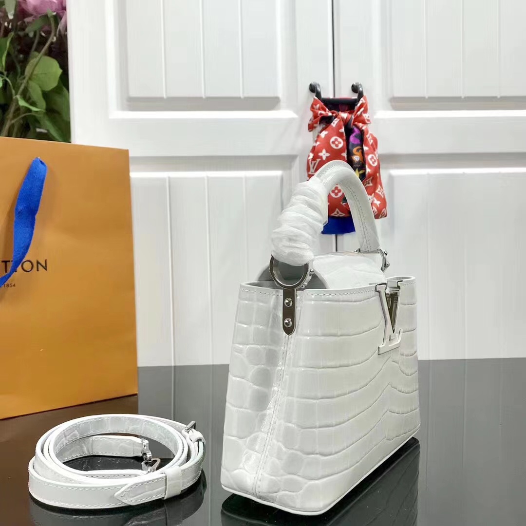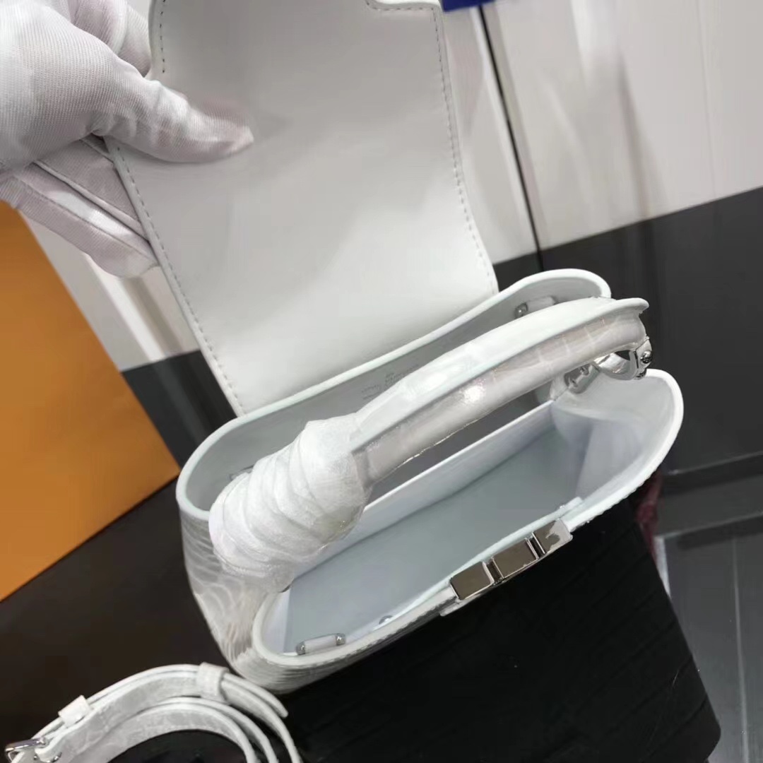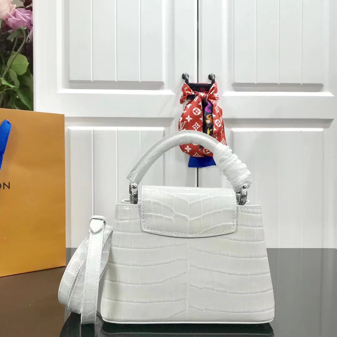 The White Nile Crocodile Mini Capucines handbag expertly combines a graceful lizard leather exterior, a delicate sheepskin lining, and lustrous hardware. Its signature flap offers two different styles: one folded inside to display the logo, and one with a monogram flower on the outside, creating a striking accent for evening occasions. Size: 21*14*8cm.