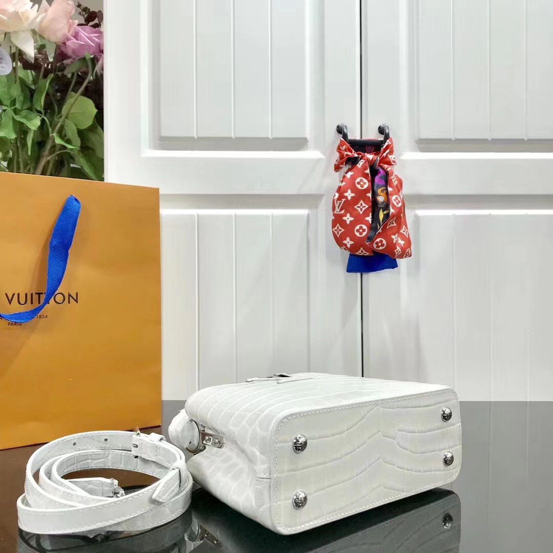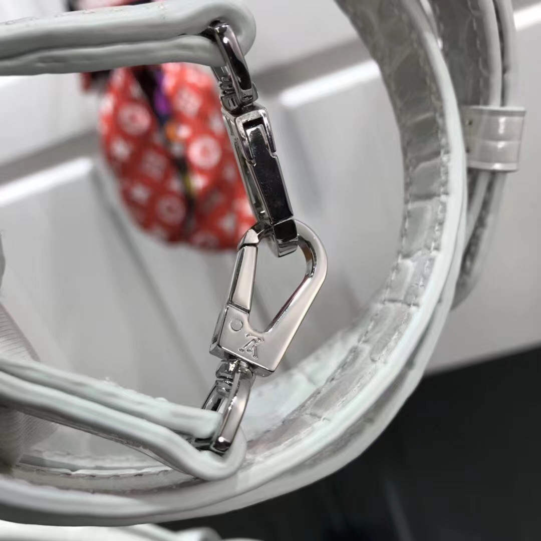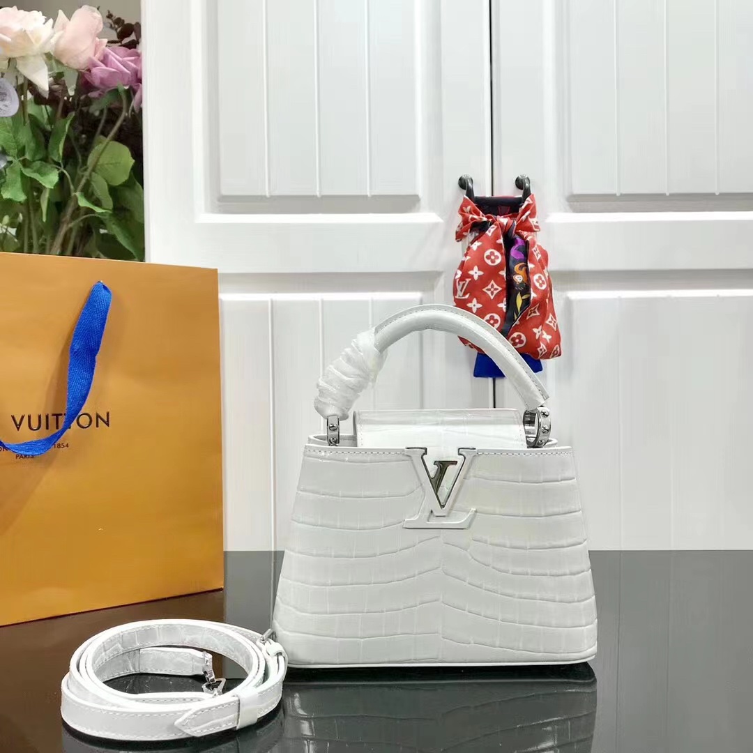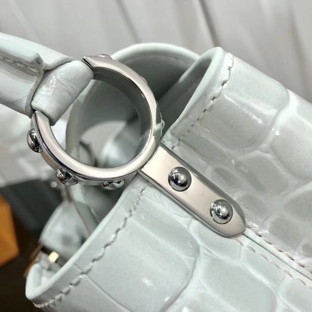 The White Nile Crocodile Mini Capucines handbag expertly combines a graceful lizard leather exterior, a delicate sheepskin lining, and lustrous hardware. Its signature flap offers two different styles: one folded inside to display the logo, and one with a monogram flower on the outside, creating a striking accent for evening occasions. Size: 21*14*8cm.