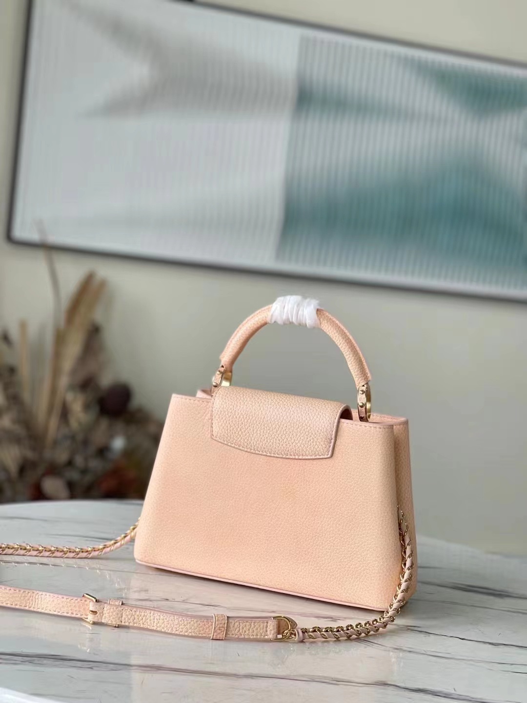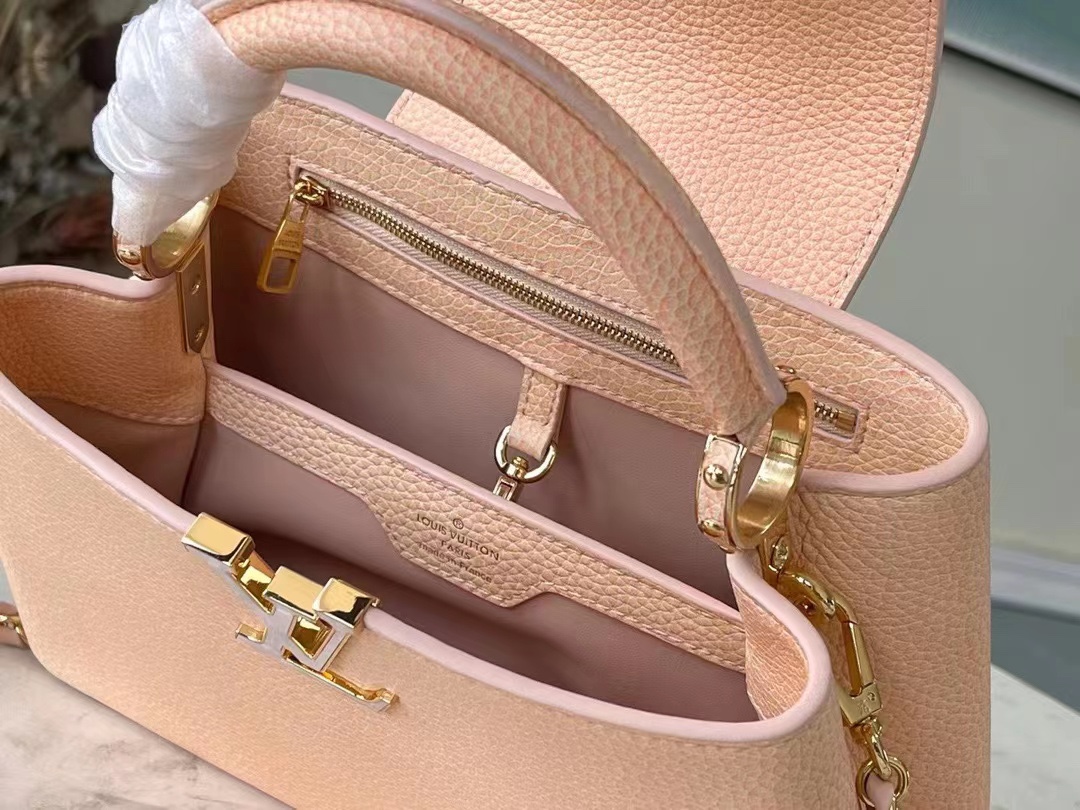 This Capucines BB bag showcases the shifting colors of Taurillon leather under different light conditions. The lettering shimmers with a seashell-like sheen, while a single handle and a detachable braided leather chain offer versatile carrying options. Dimensions: 27 x 18 x 9 cm