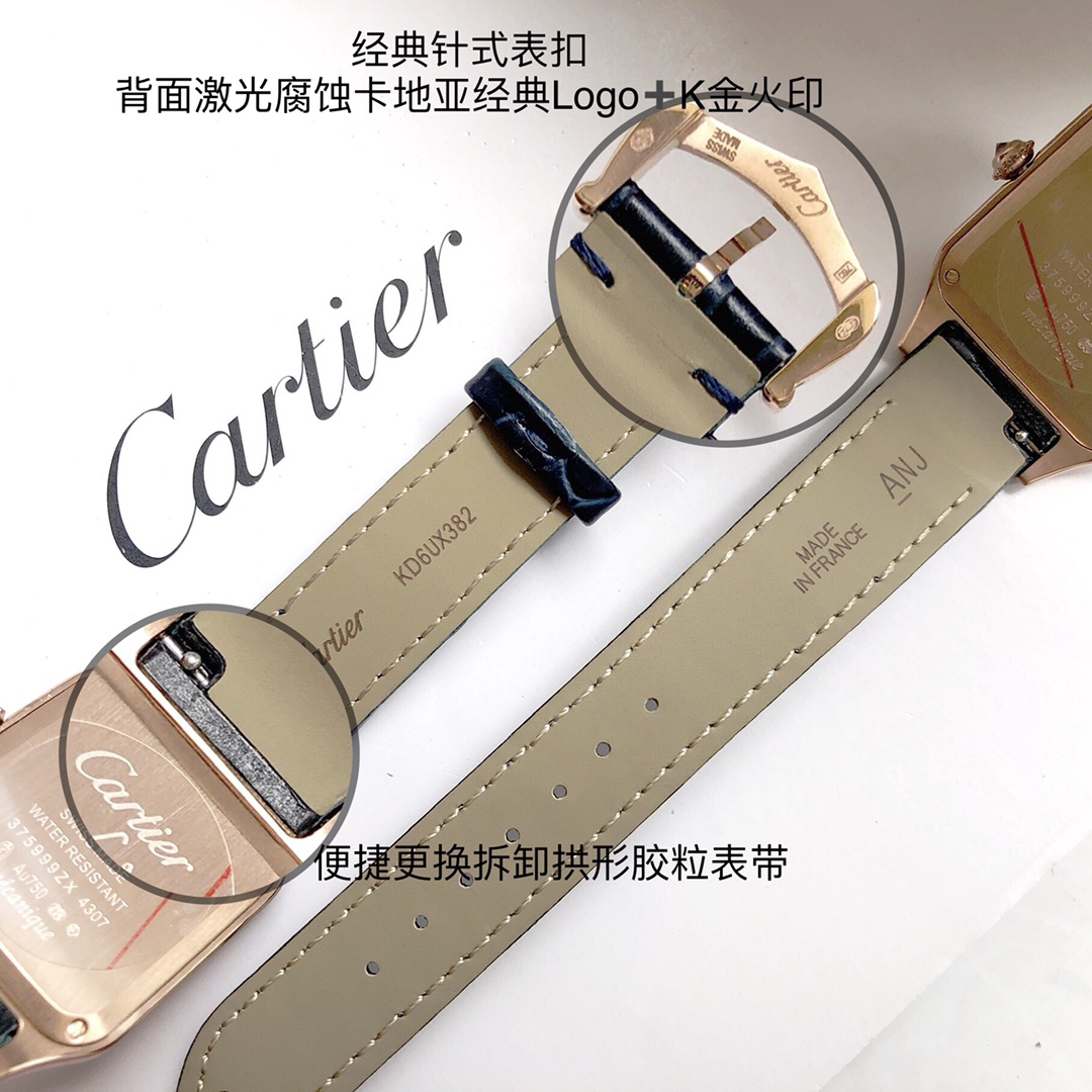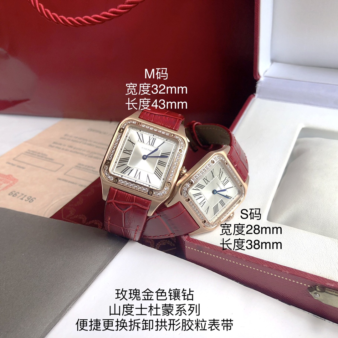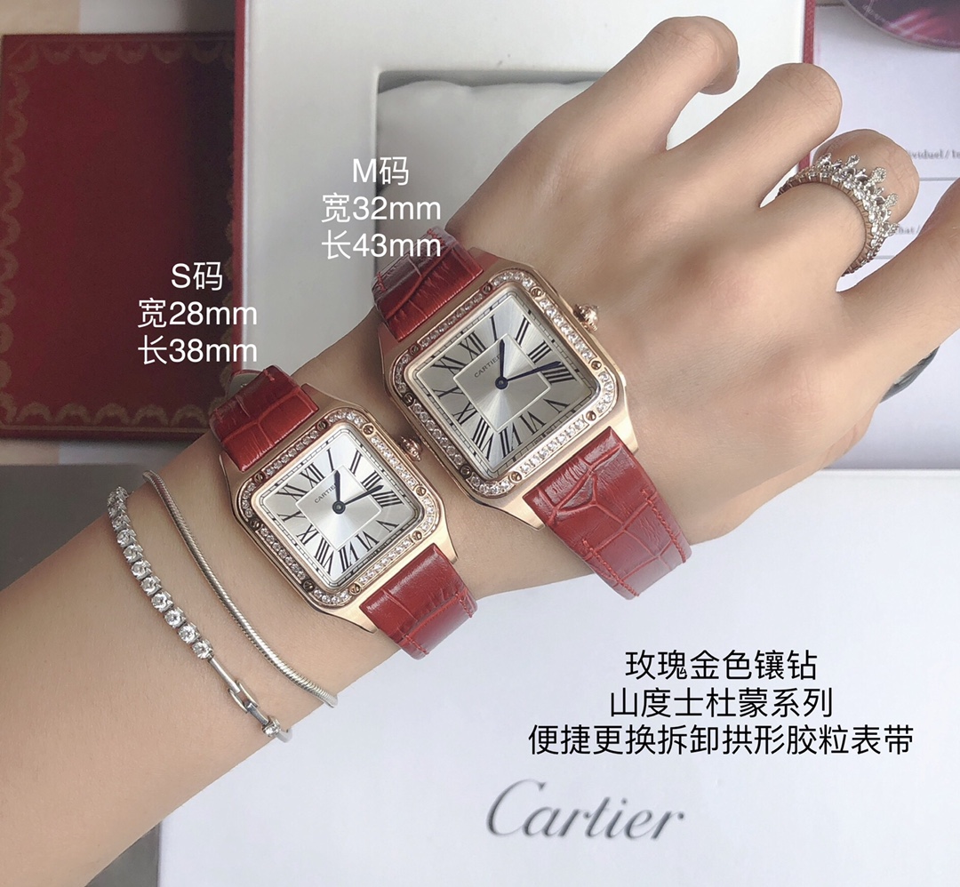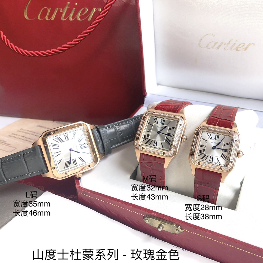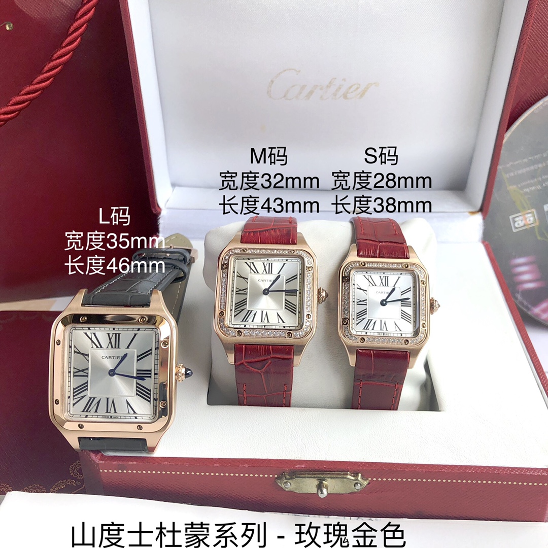 Santos-Dumont Cartier Santos-Dumont ultra-thin watch series, couple’s matching watches, 316L stainless steel case, sapphire cabochon crown, sunray brushed finish, classic Roman numeral hour markers, tempered steel blue hands, fish-eye crystalline watch glass, easy-to-change strap device, stainless steel pin buckle clasp. Case sizes: Extra large men’s L size, width 35mm, length 46mm. Large unisex size, width 32mm, length 43mm. Small women’s size, width 28mm, length 38mm.