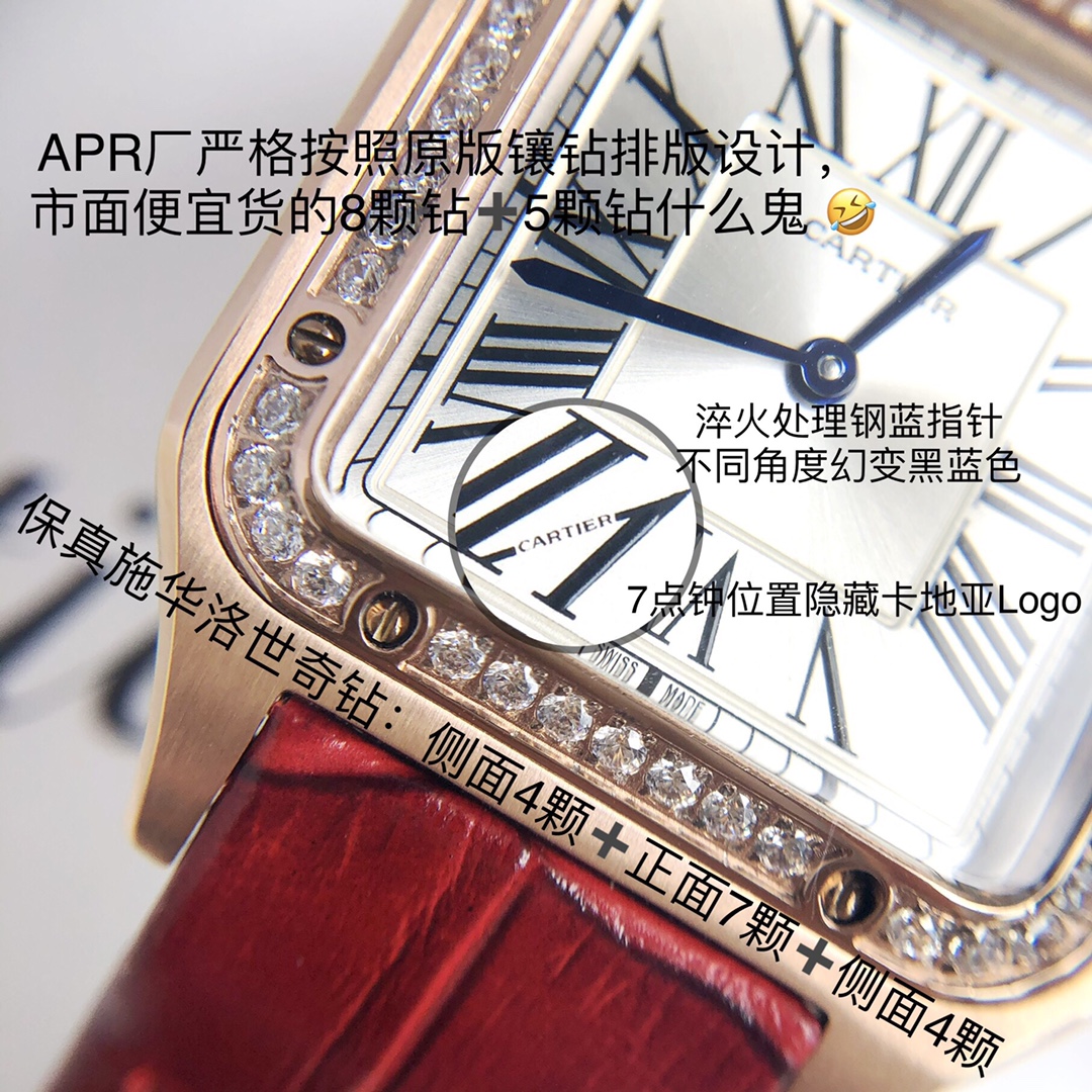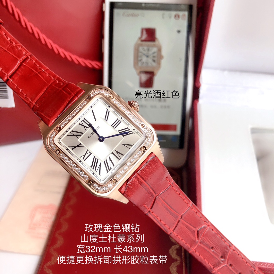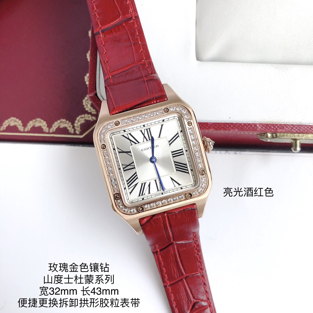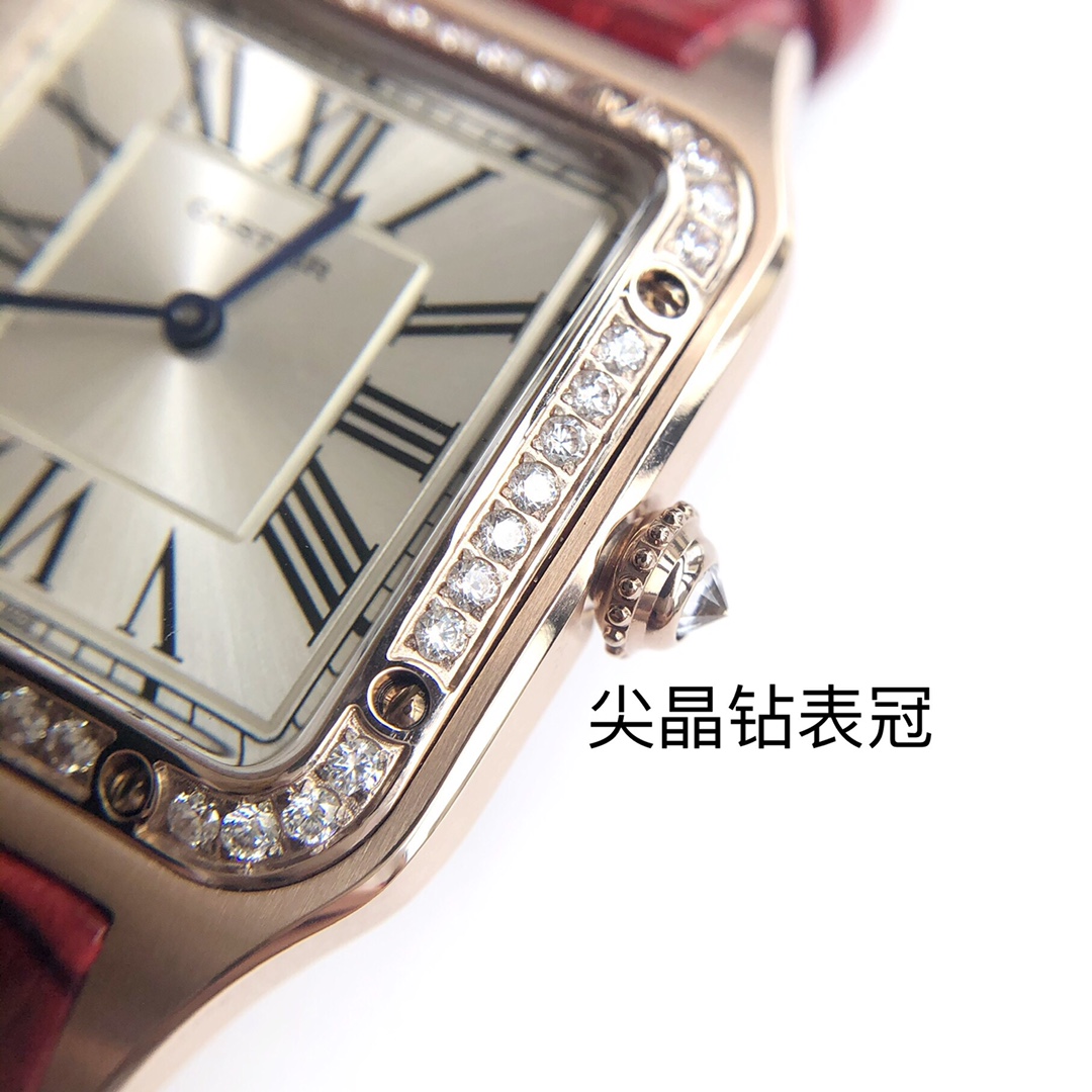 Santos-Dumont Cartier Santos-Dumont ultra-thin watch series, couple’s matching watches, 316L stainless steel case, sapphire cabochon crown, sunray brushed finish, classic Roman numeral hour markers, tempered steel blue hands, fish-eye crystalline watch glass, easy-to-change strap device, stainless steel pin buckle clasp. Case sizes: Extra large men’s L size, width 35mm, length 46mm. Large unisex size, width 32mm, length 43mm. Small women’s size, width 28mm, length 38mm.
